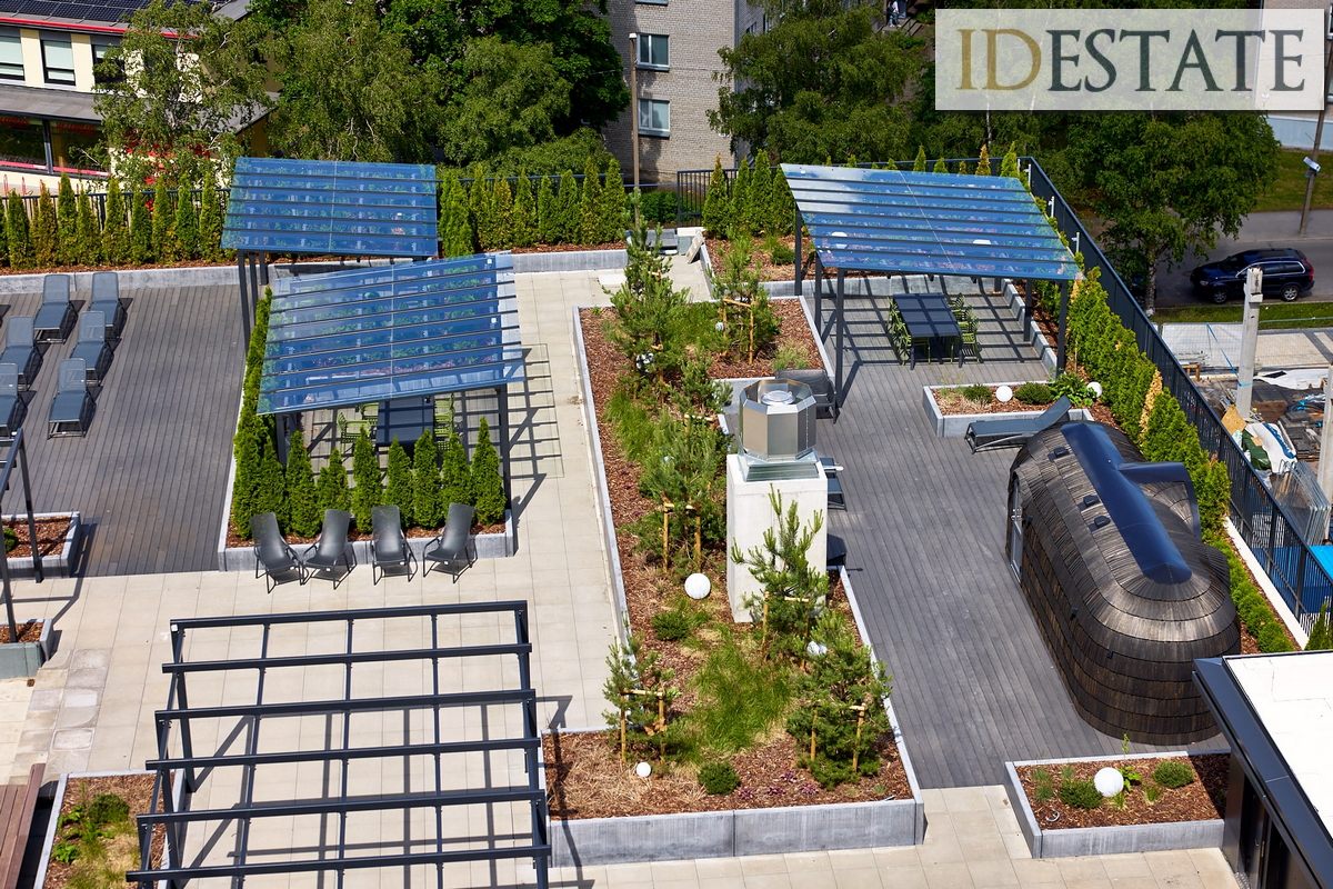 Hoone sisehoovi, parkimismaja katusel on suur haljastatud katuseaed (1 500m2), kus asuvad privaatsed puhkealad laudade ja toolidega; grillimisala sõpradega aja veetmiseks; päevitustoolid mõnusaks äraolemiseks; välijõusaal ja iglusaun.